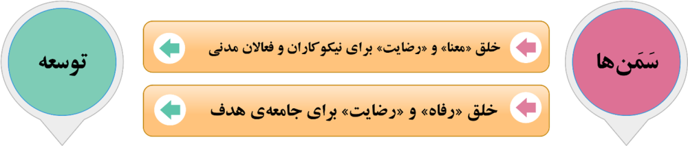 سَمَن‌ها، دارای ارزش ذاتی هستند و مهم‌ترین ارزشِ این نوع نهادها خدمت به انسان و حفظ ذخایر ارزش‌ها و زیبایی‌هاست. به همین خاطر، فعالیت در حوزه‌های اجتماعی، زمینه‌سازِ ایجاد رضایت نیز می‌گردد. در واقع، توسعه مثلثی است با سه ضلع: رفاه، رضایت و معنا. جامعه‌ای به سوی توسعه حرکت می‌کند که بتواند به طور مستمر، این سه بُعد را بهبود و ارتقا ببخشد. زندگی هرچه پُر‌رفاه و پُر‌رضایت هم باشد، اگر فاقد معنا باشد در نهایت، نقطه‌ای فرا‌خواهد رسید که به ما »احساس باخت  «دست خواهد داد. اگر بیل گیتس، به عنوان یکی از ثروتمندترین چهره‌های جهان، به آفریقا می‌رود و بخشی از ثروتش را برای واکسیناسیون کودکان آفریقایی وقف می‌کند، برای کسب بُعد معنوی و معنابخشی به زندگی خویش، چنین می‌کند؛ وگرنه بیل‌گیتس، چیزی از «رفاه» و «رضایت» کم ندارد.